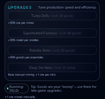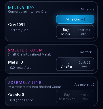 Build a tiny neon factory where Ore → Metal → Goods in a clean, single-file HTML5 template.