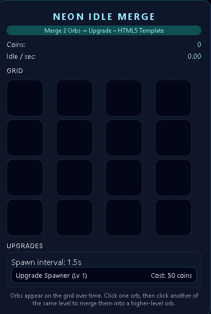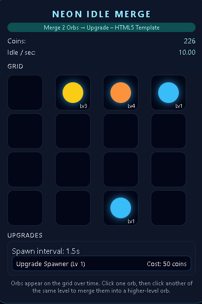 Neon Idle Merge – HTML5 Merge Template (Orb Fusion + Passive Income)