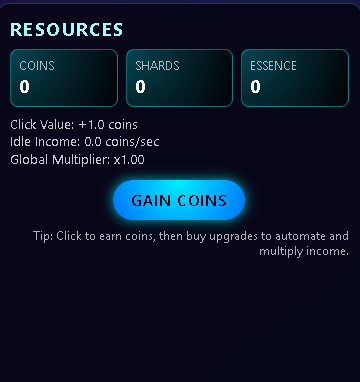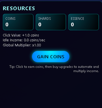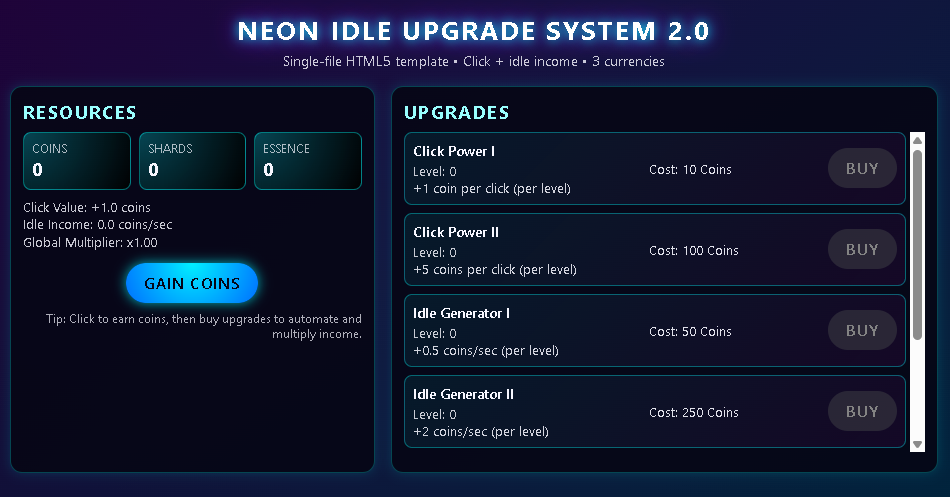 Neon Idle Upgrade System 2.0 – HTML5 Template (3 Currencies + Scaling Costs)